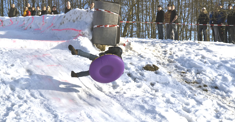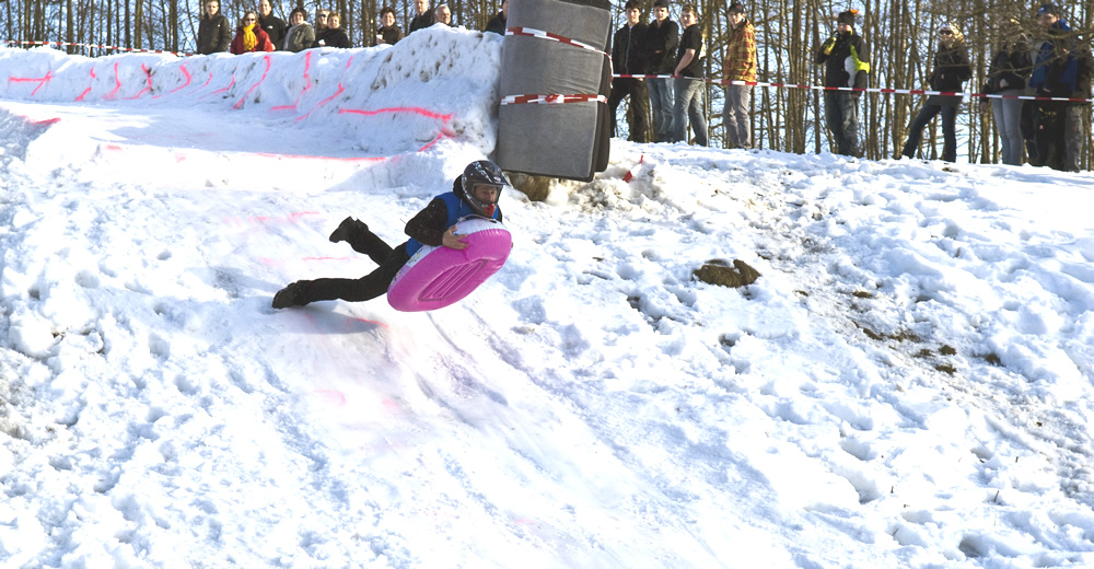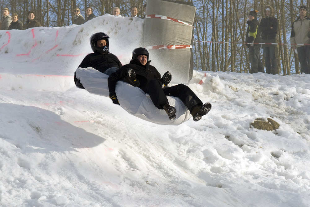 60 km/h und mehr stehen auf dem Tacho, geschützt mit Helm und einem „weichen“ Gefährt steht dem Spass in Frau Holle’s Staub nichts mehr im Wege. Eigentlich muss man ganz schön verrückt sein, die Piste, 300 Meter lang, auf einem aufblasbaren „Dingsbums“ herunterzubrettern – aber es ist lustig. Herrlich ist die Mimik und Gestik der Teilnehmer beim Zielsprung anzusehen. Verrückt, aber lustig.
